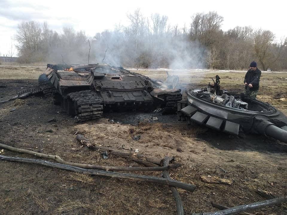 وبثت وزارة الدفاع الأوكرانية صورا توثق عددا من الدبابات والمدرعات المدمرة على إحدى الطرق الرئيسية المؤدية إلى المدينة.